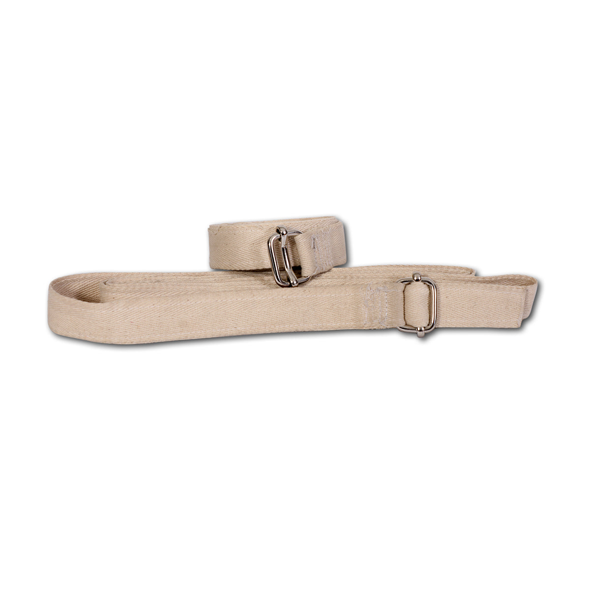 The Shoulder Belt is a versatile yoga accessory designed to aid in the alignment and locking of body parts. It helps practitioners hold postures for longer durations. The set includes two cotton straps, each with a steel buckle attached at one end, featuring a locking mechanism for secure adjustments.